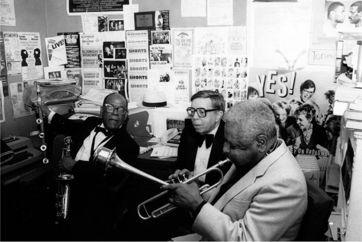 Mario Bauza (left), Marco Rizo, composer of the theme music for “I Love Lucy,” and Dizzy Gillespie; at Bauza’s 80th Anniversary Celebration at Symphony Space in Hall in 1991