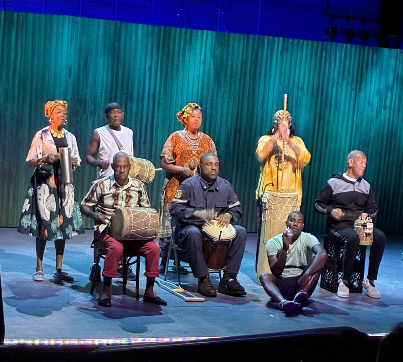 The eight-member Parranda El Clavo group on stage is a small representation of the actual parranda. “The parranda is the whole town,” says singer Betsayda Machado. “But I couldn’t bring the whole town onto the stage.” From left to right, top row, Nereida Machado, Oscar Ruiz, Betsayda Machado, and Blanca Castillo; seated, Adrian “Ote” Gómez, Youse Cardozo, Nelson Gómez, and Asterio Betancourt, performing on opening night. (Photo by Fernando Gonzalez)