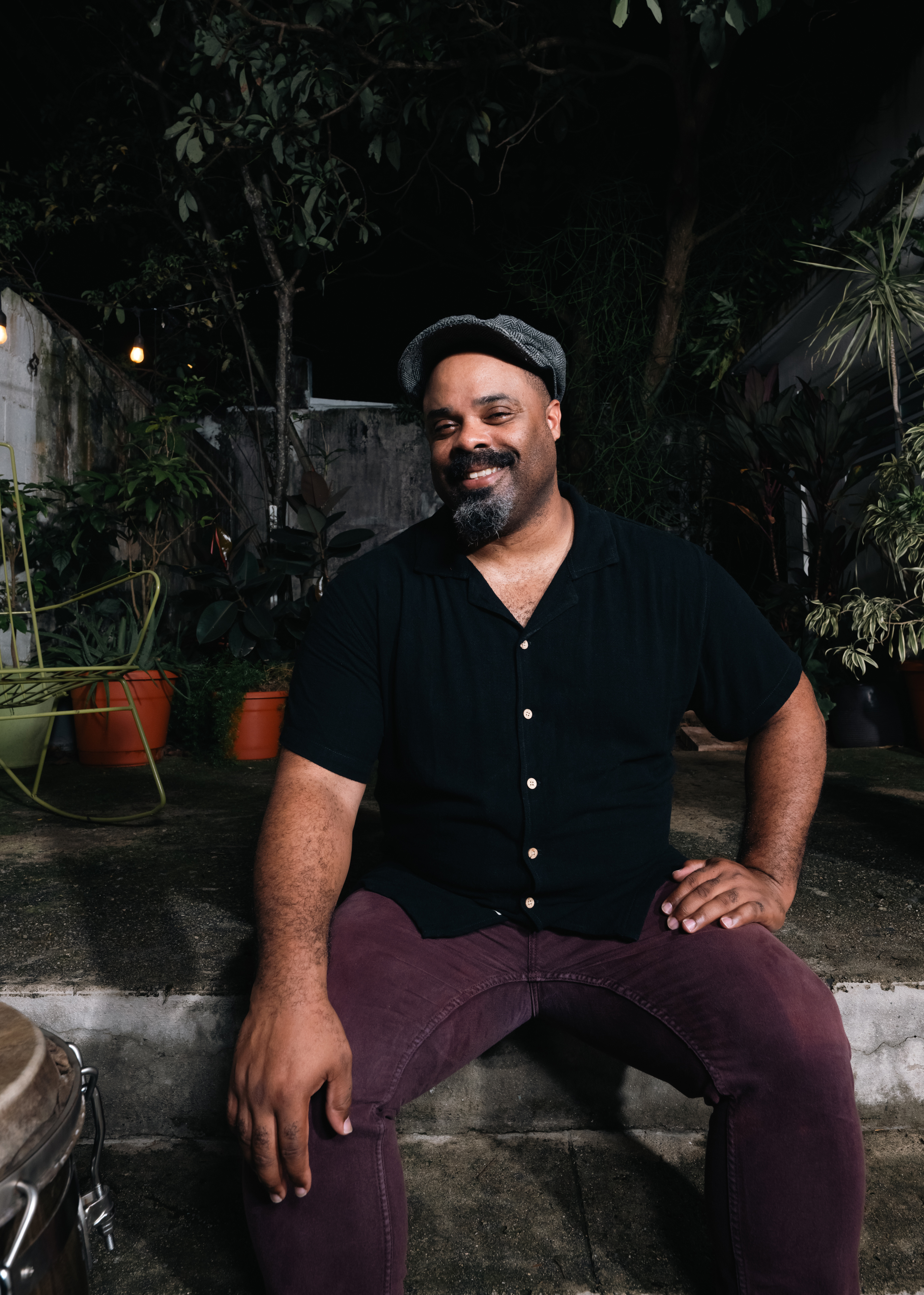 Percussionist, composer, and bandleader Hector “Coco” Barez has performed with major acts such as Calle 13, Don Omar, and Shakira before launching his 14-piece band El Laberinto del Coco (Coco’s Maze). He says he wondered, “Why don’t people dare to make a whole Bomba album? So, we did.” (Photo by Alex Diaz courtesy of Live Arts Miami)